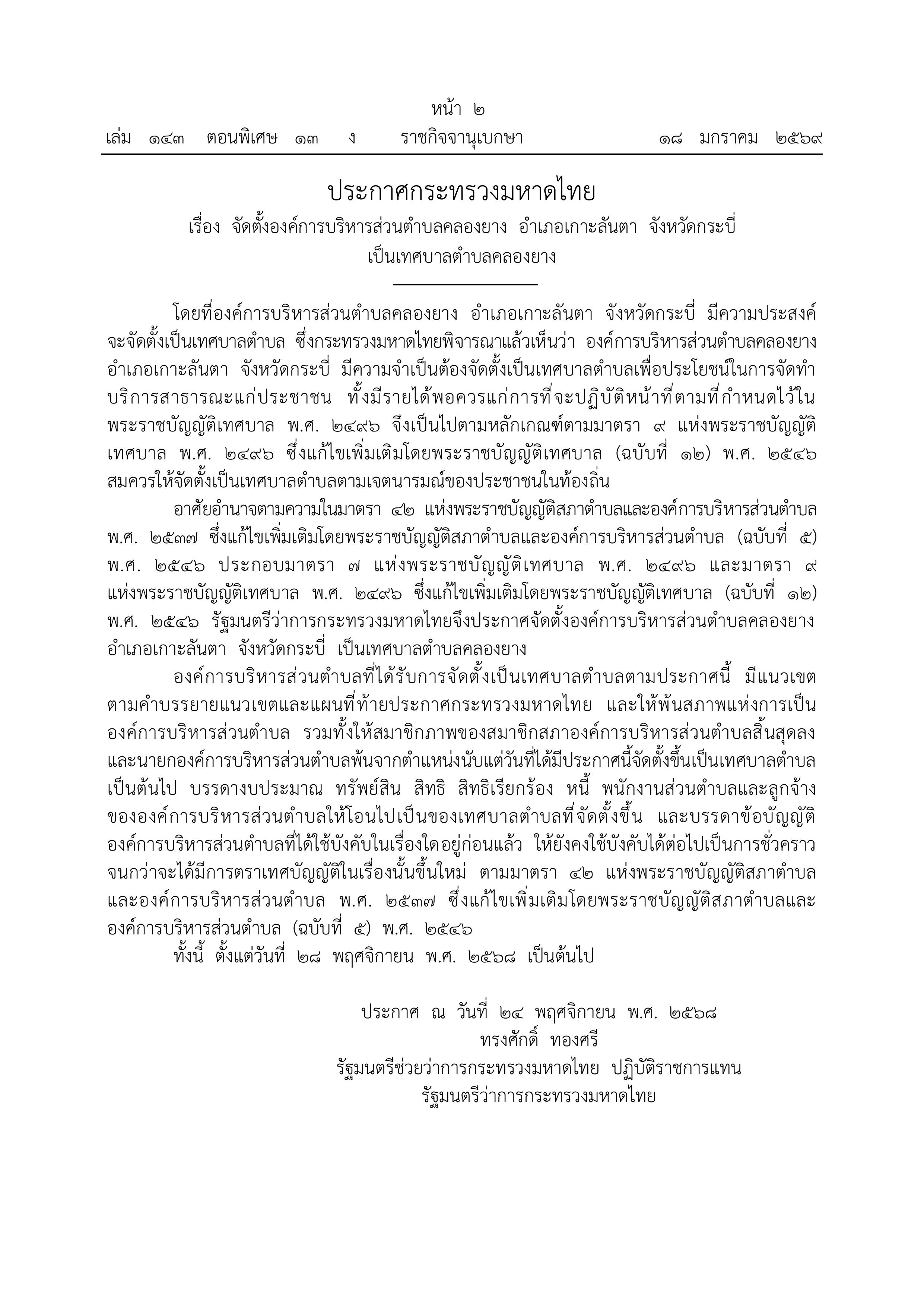 ประกาศราชกิจจานุเบกษา เรื่อง จัดตั้งองค์การบริหารส่วนตำบลคลองยาง อำเภอเกาะลันตา จังหวัดกระบี่ เป็นเทศบาลตำบลคลองยาง
