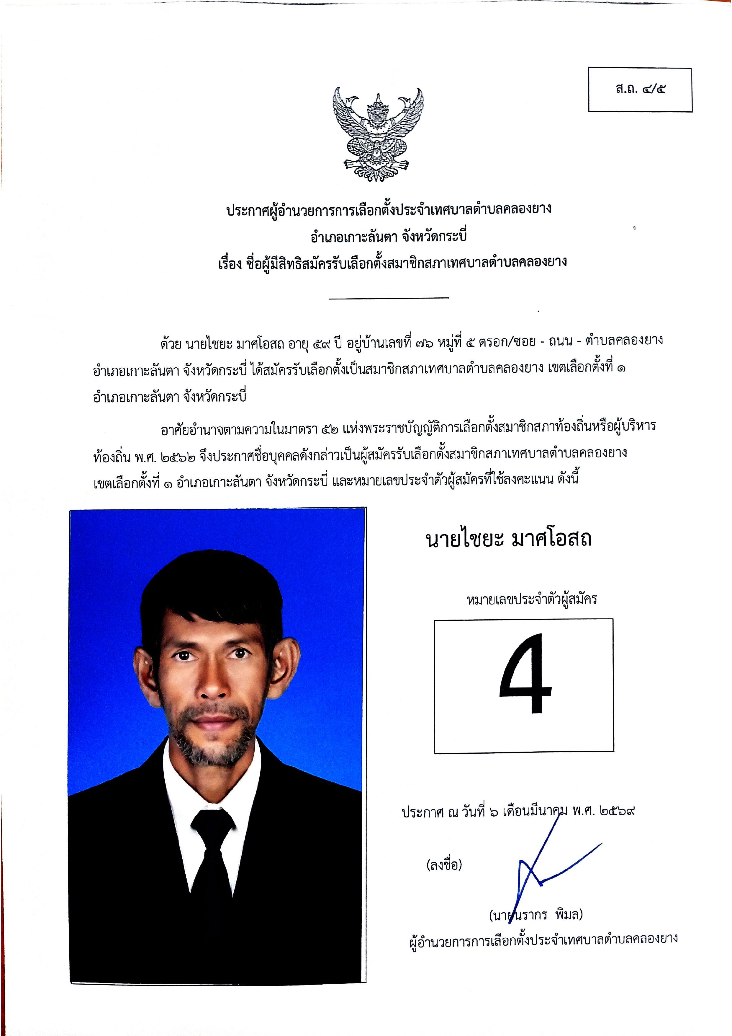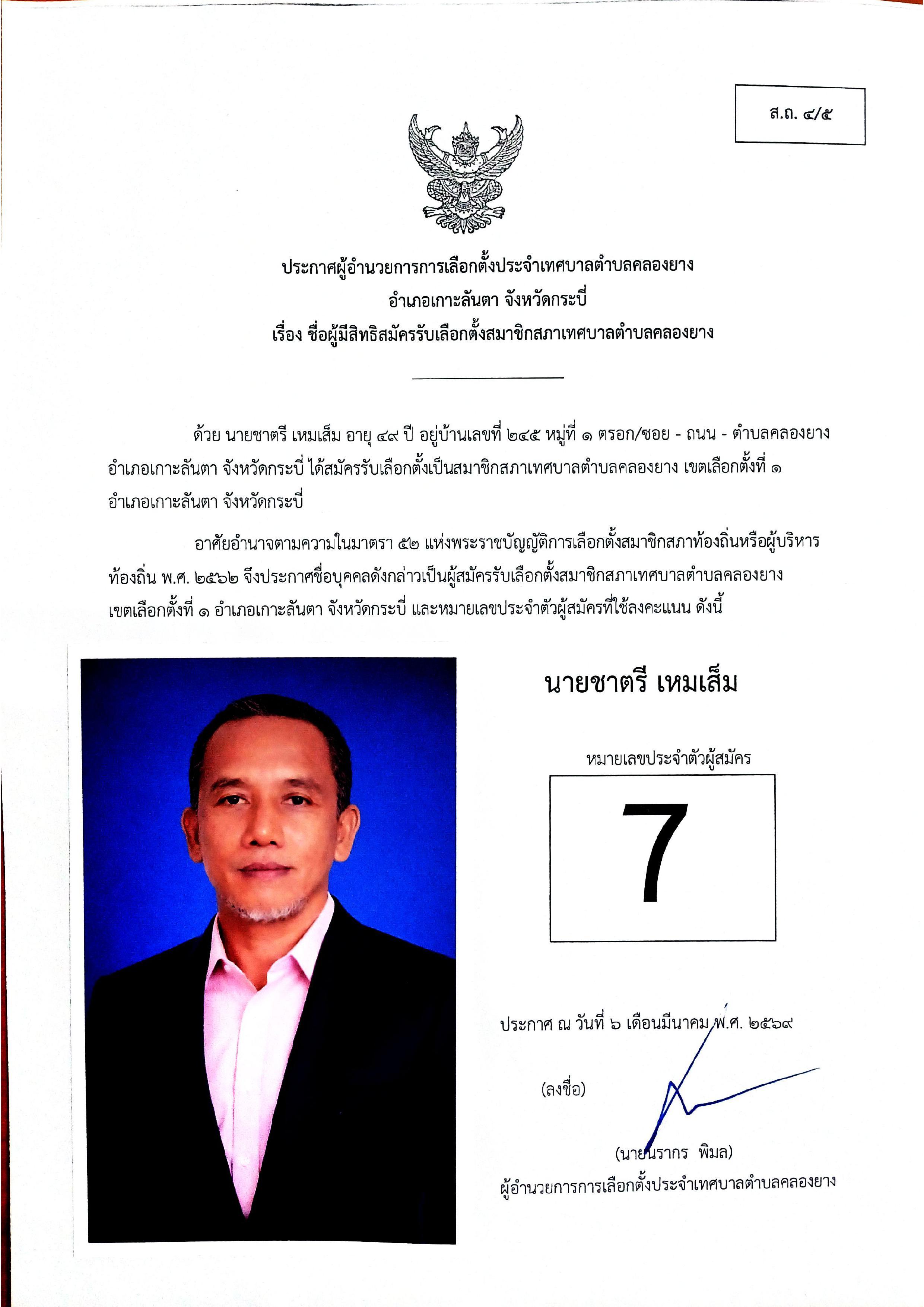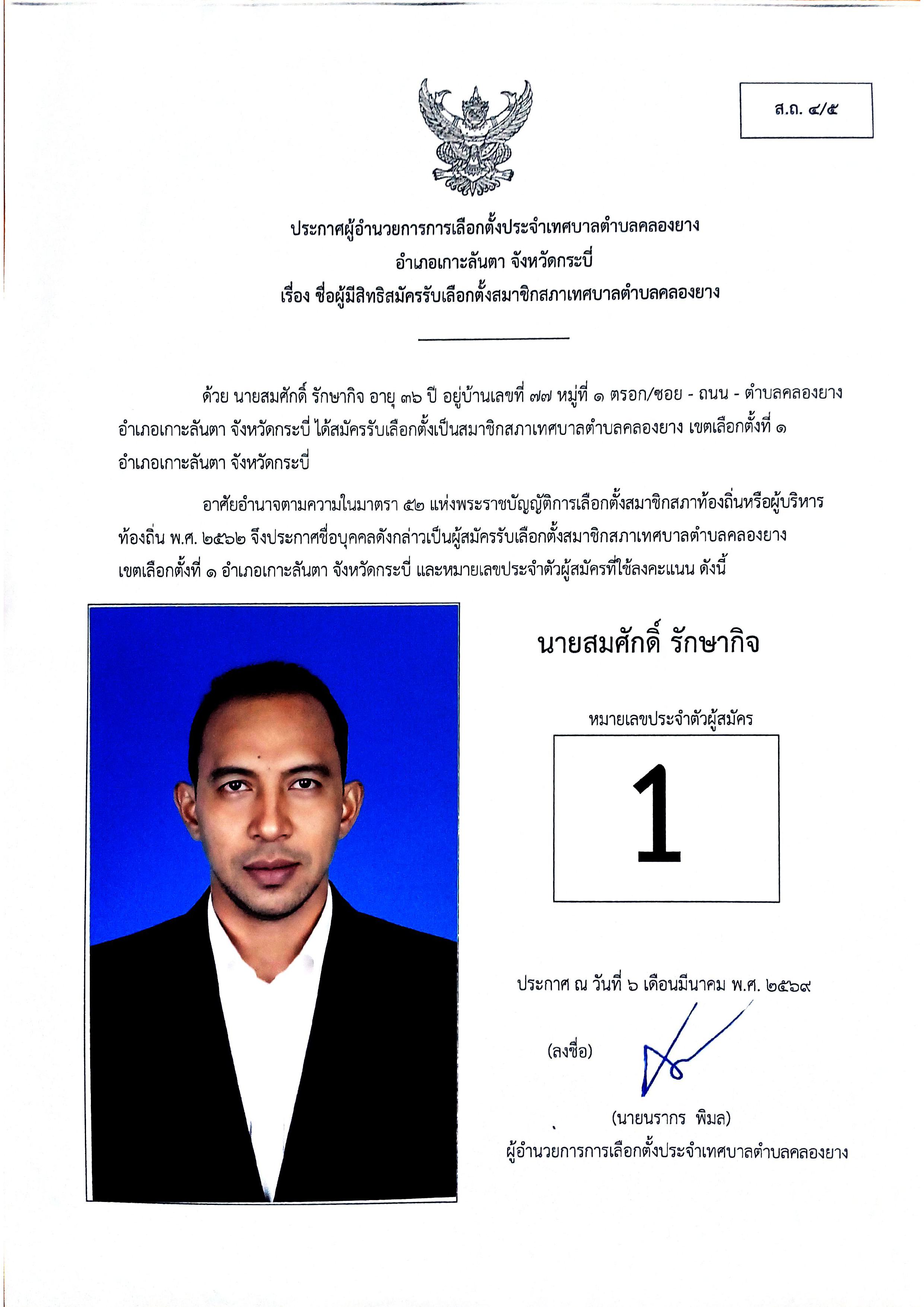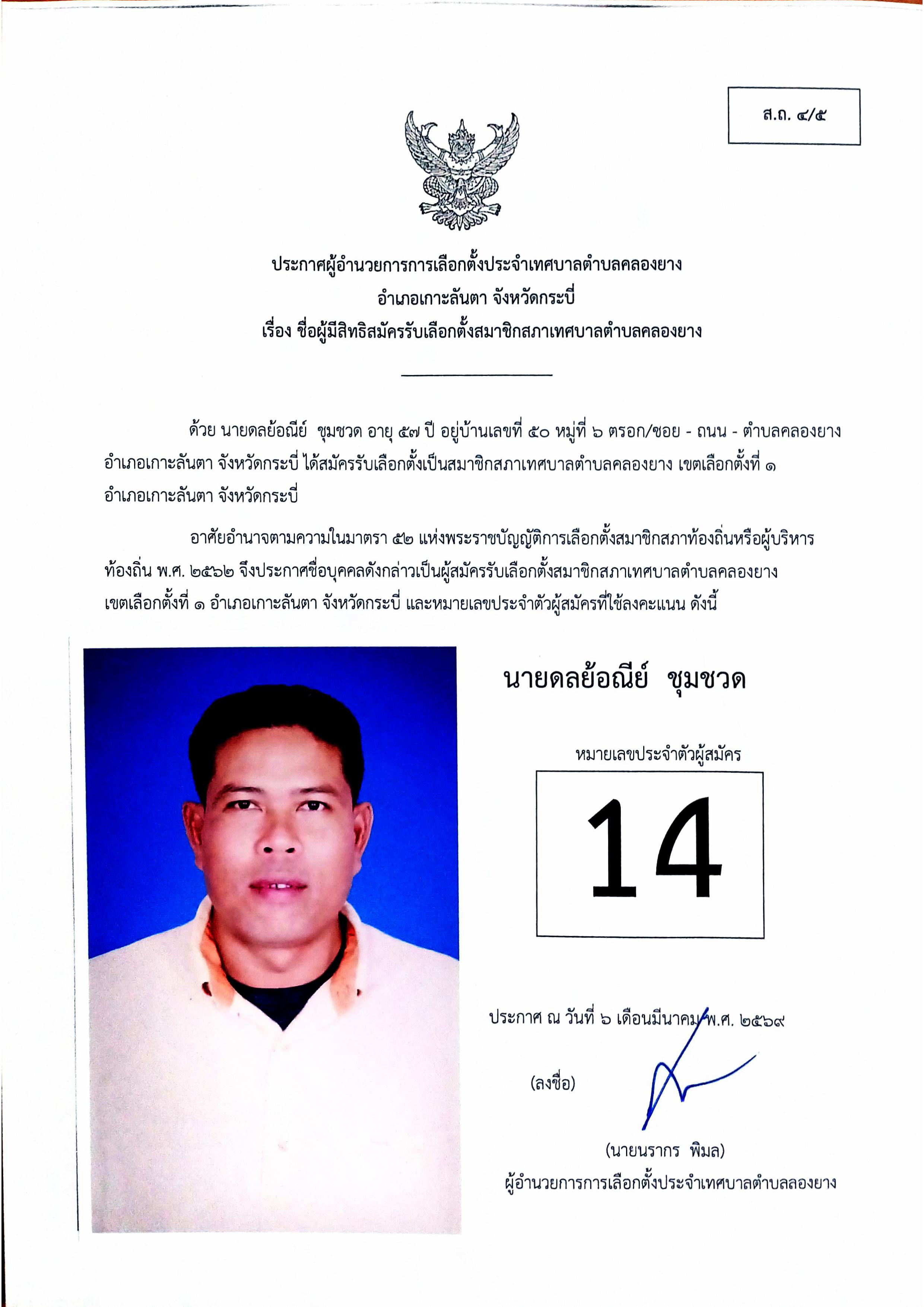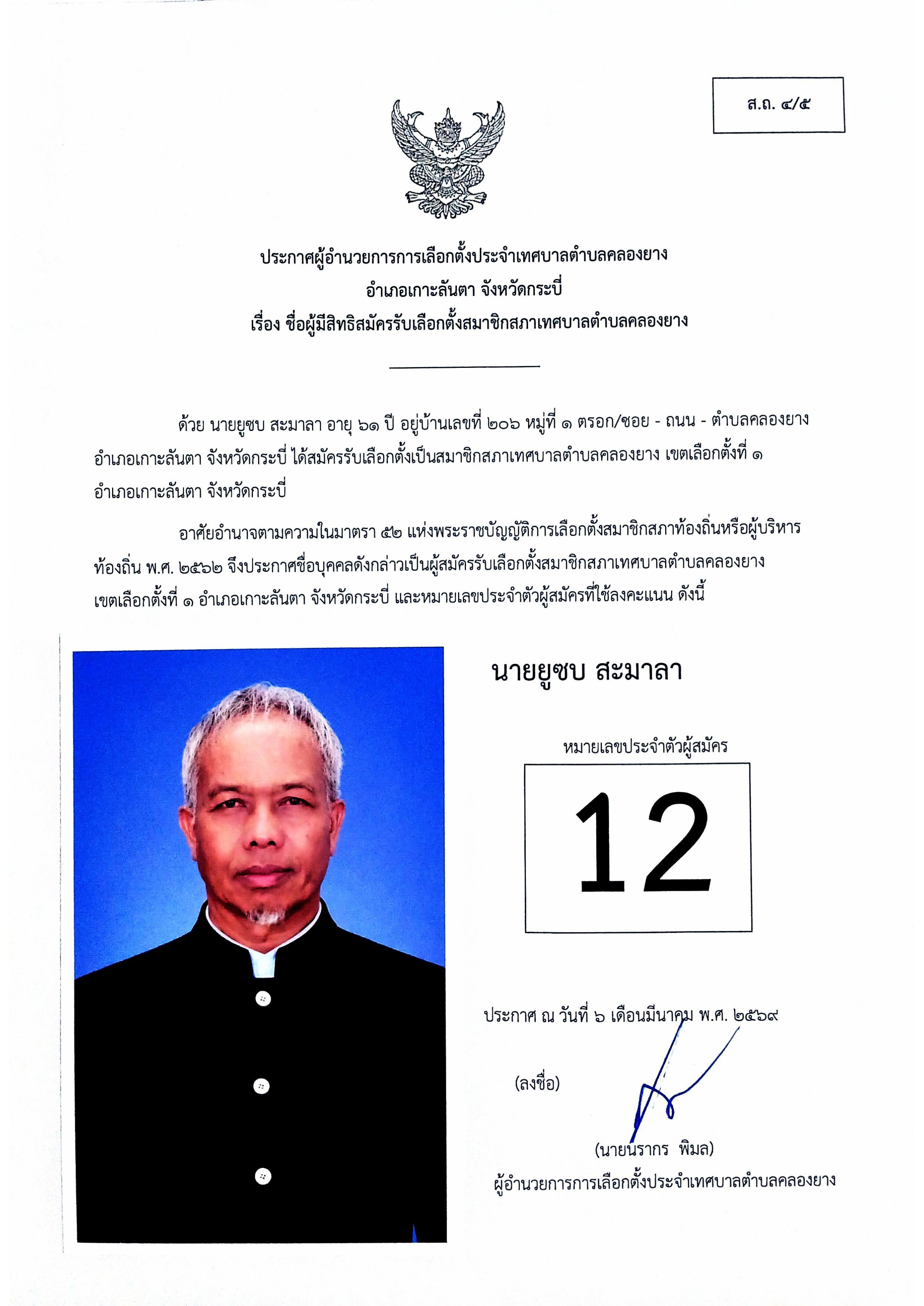 ประกาศชื่อผู้มีสิทธิสมัครรับเลือกตั้งสมาชิกสภาเทศบาลตำบลคลองยาง เขตเลือกตั้งที่ 1