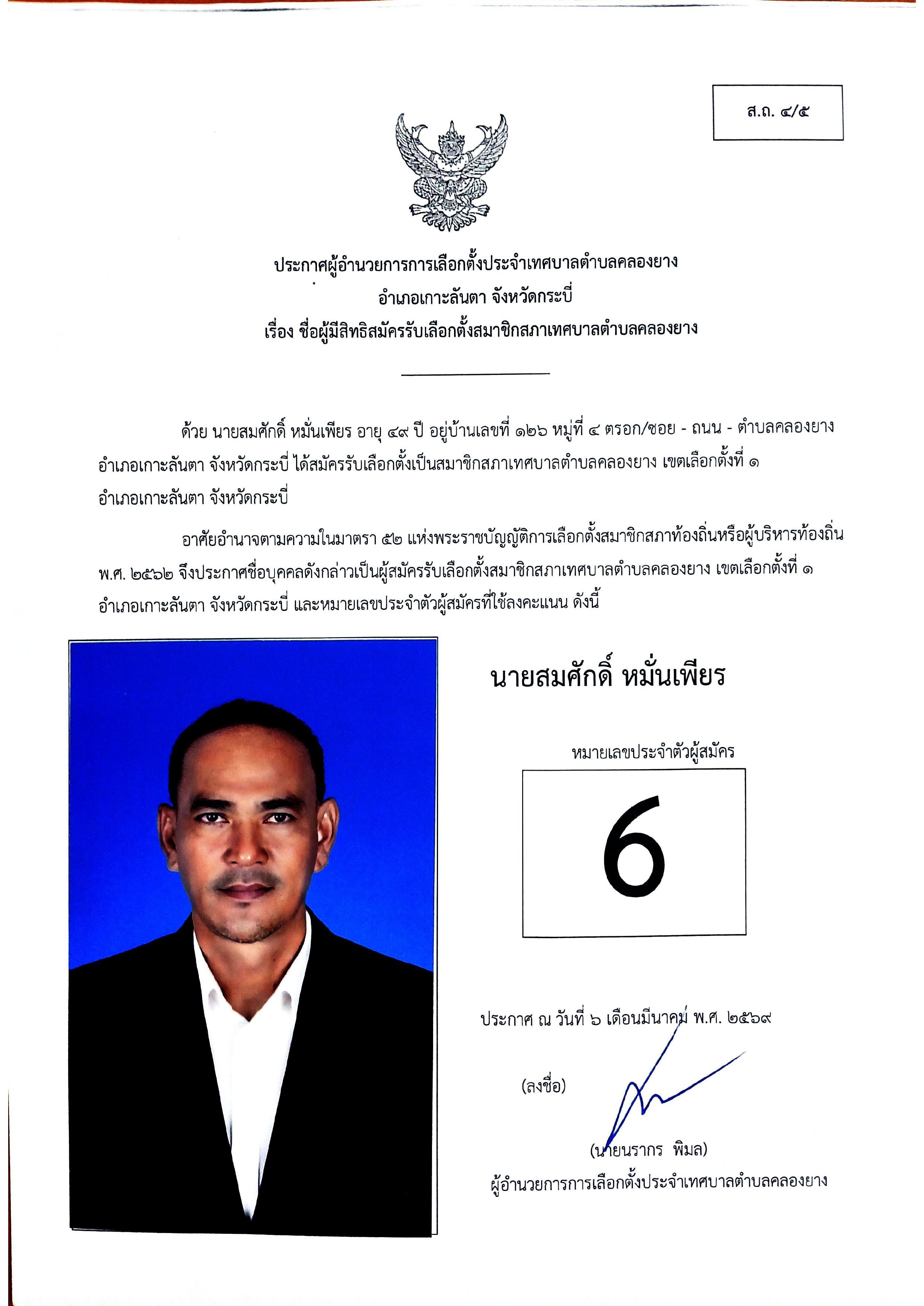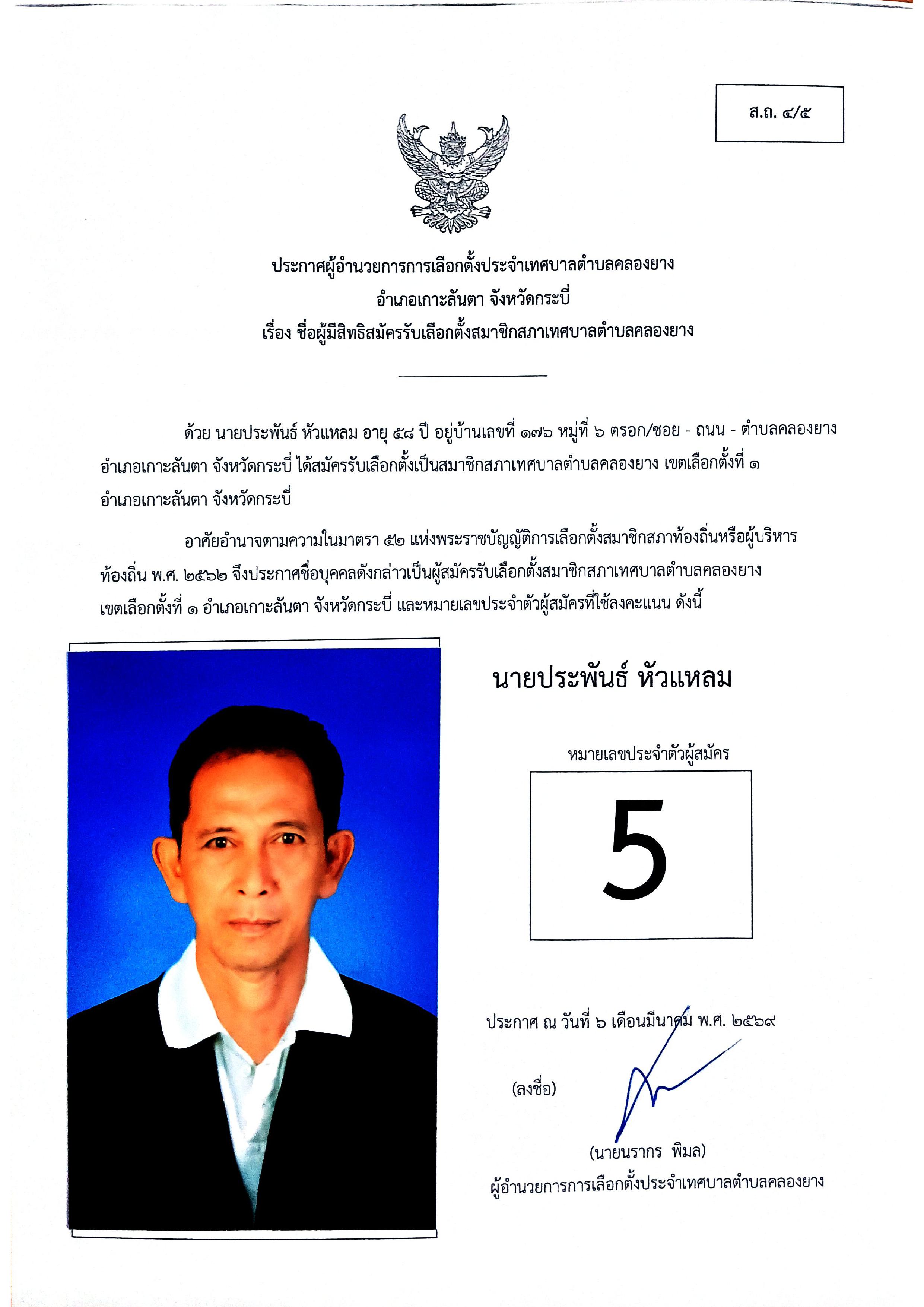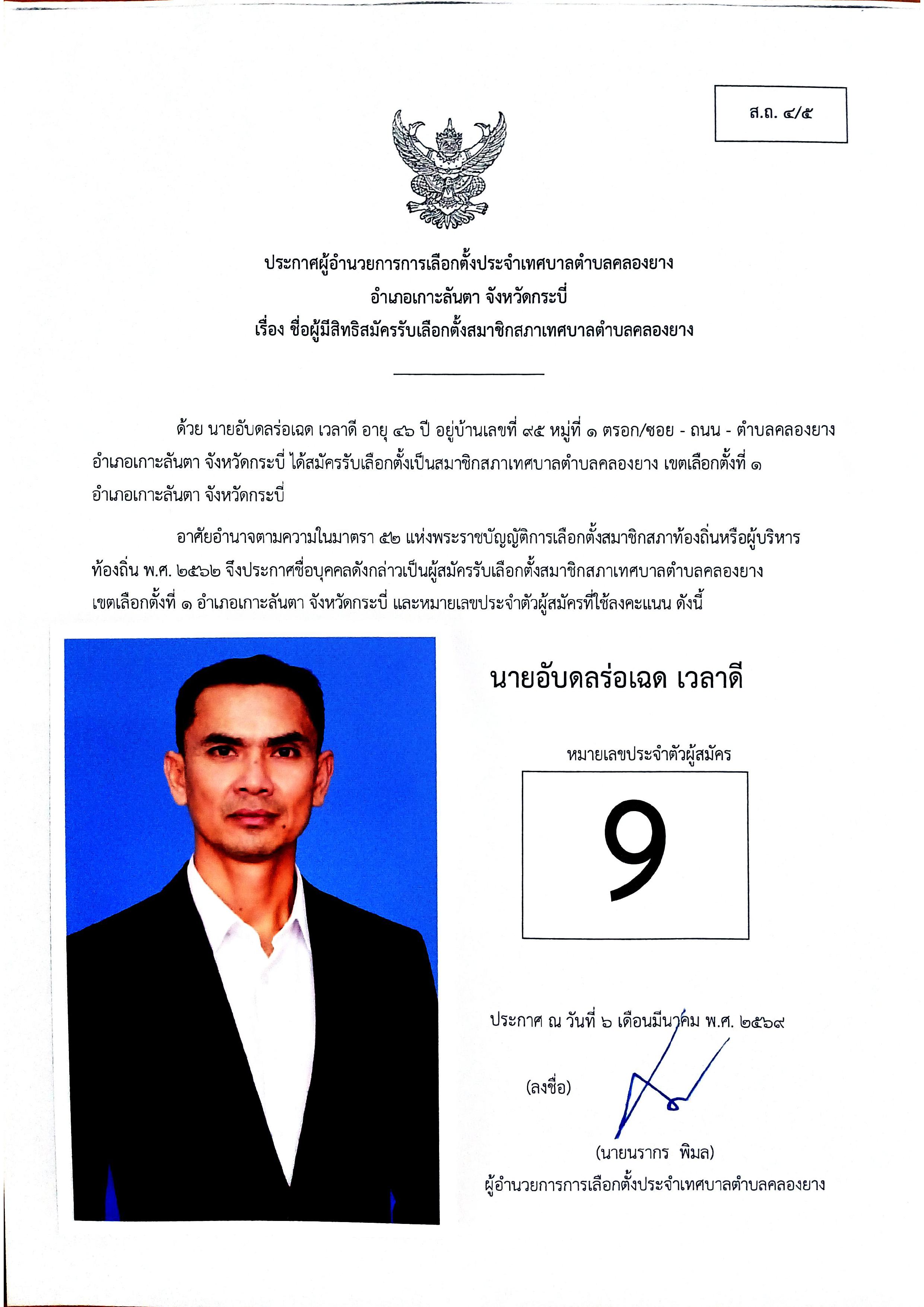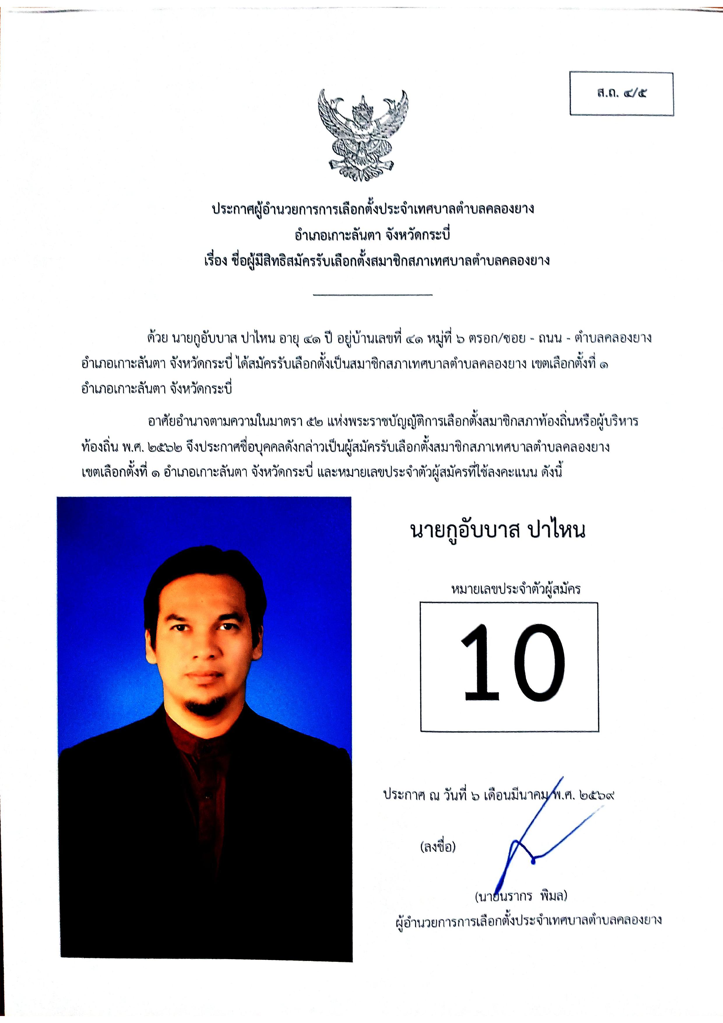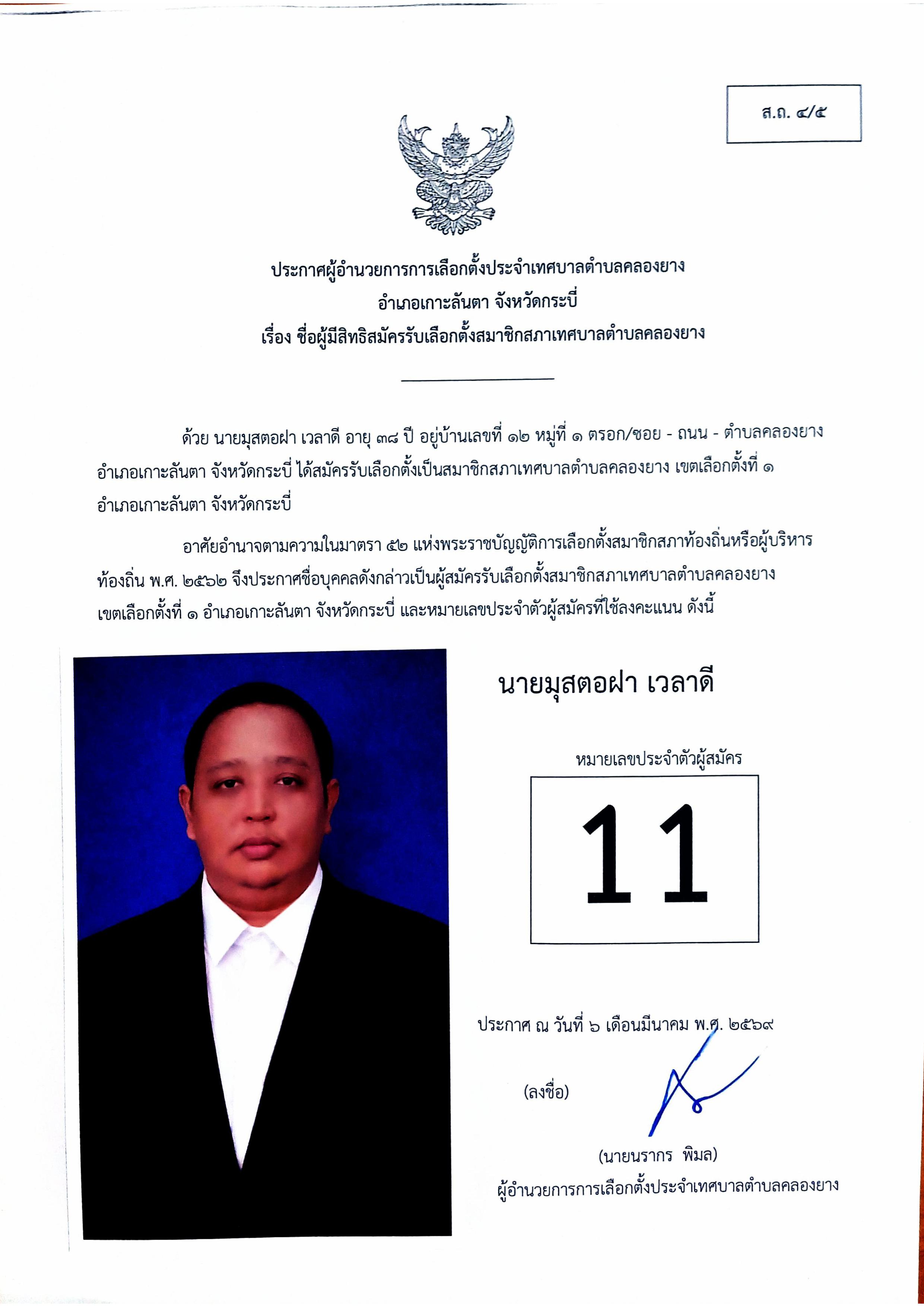 ประกาศชื่อผู้มีสิทธิสมัครรับเลือกตั้งสมาชิกสภาเทศบาลตำบลคลองยาง เขตเลือกตั้งที่ 1