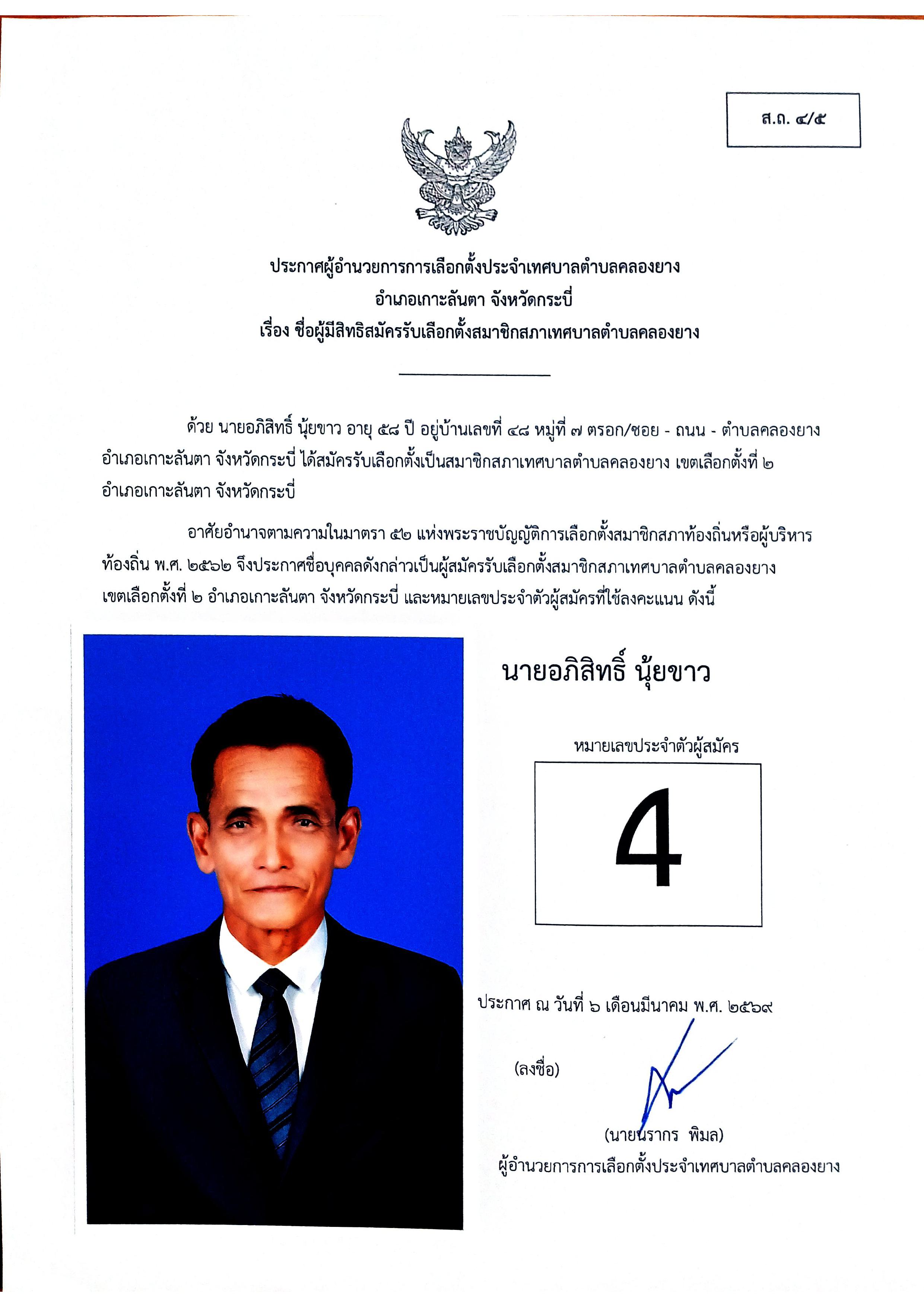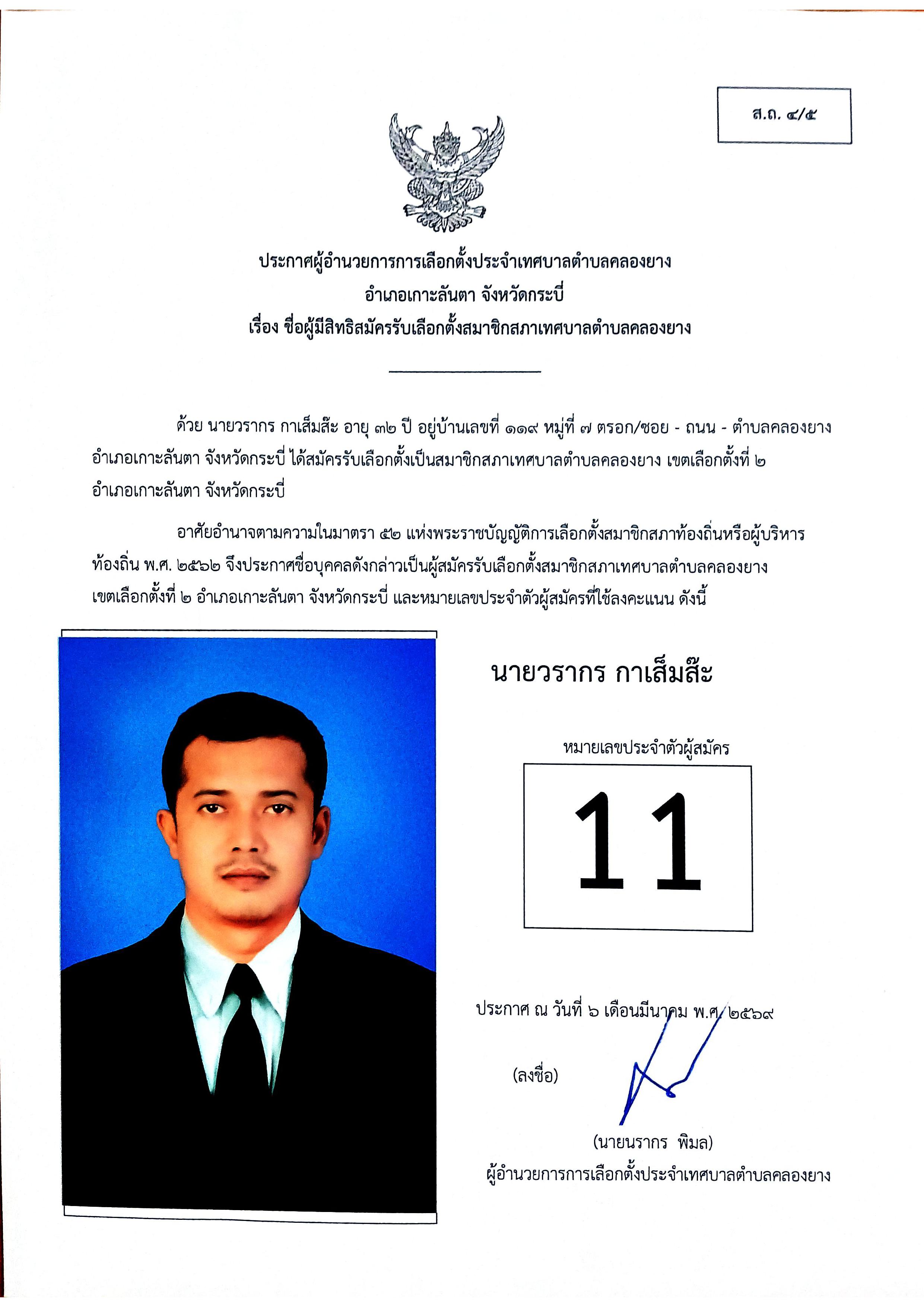 ประกาศชื่อผู้มีสิทธิสมัครรับเลือกตั้งสมาชิกสภาเทศบาลตำบลคลองยาง