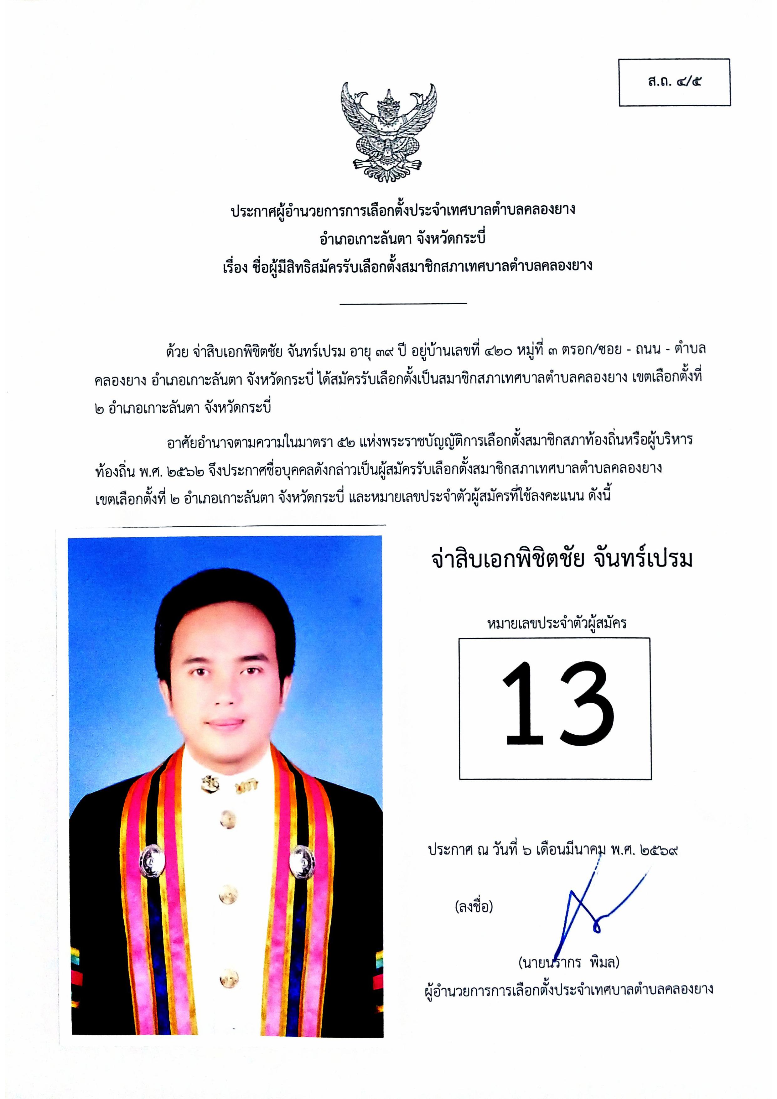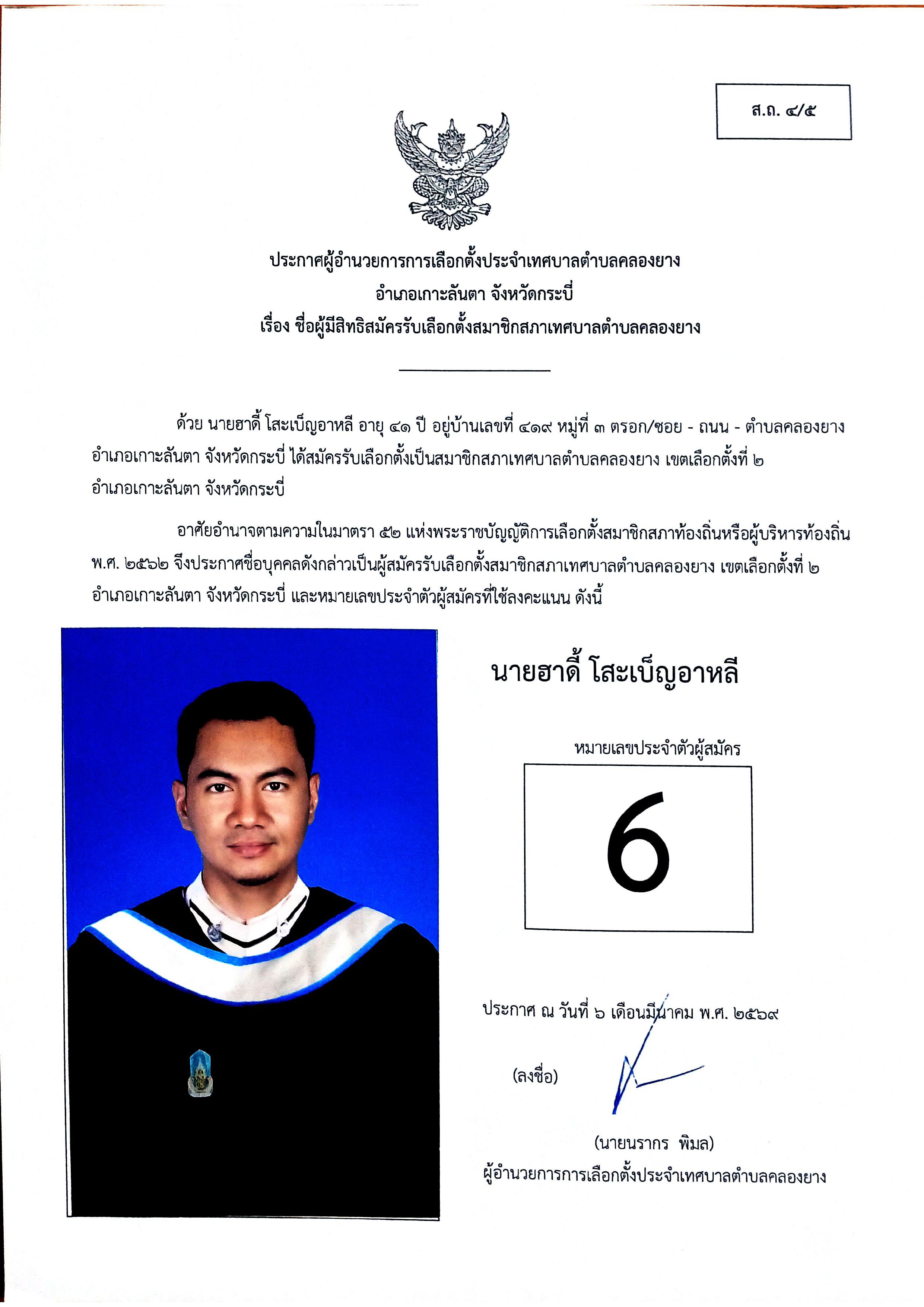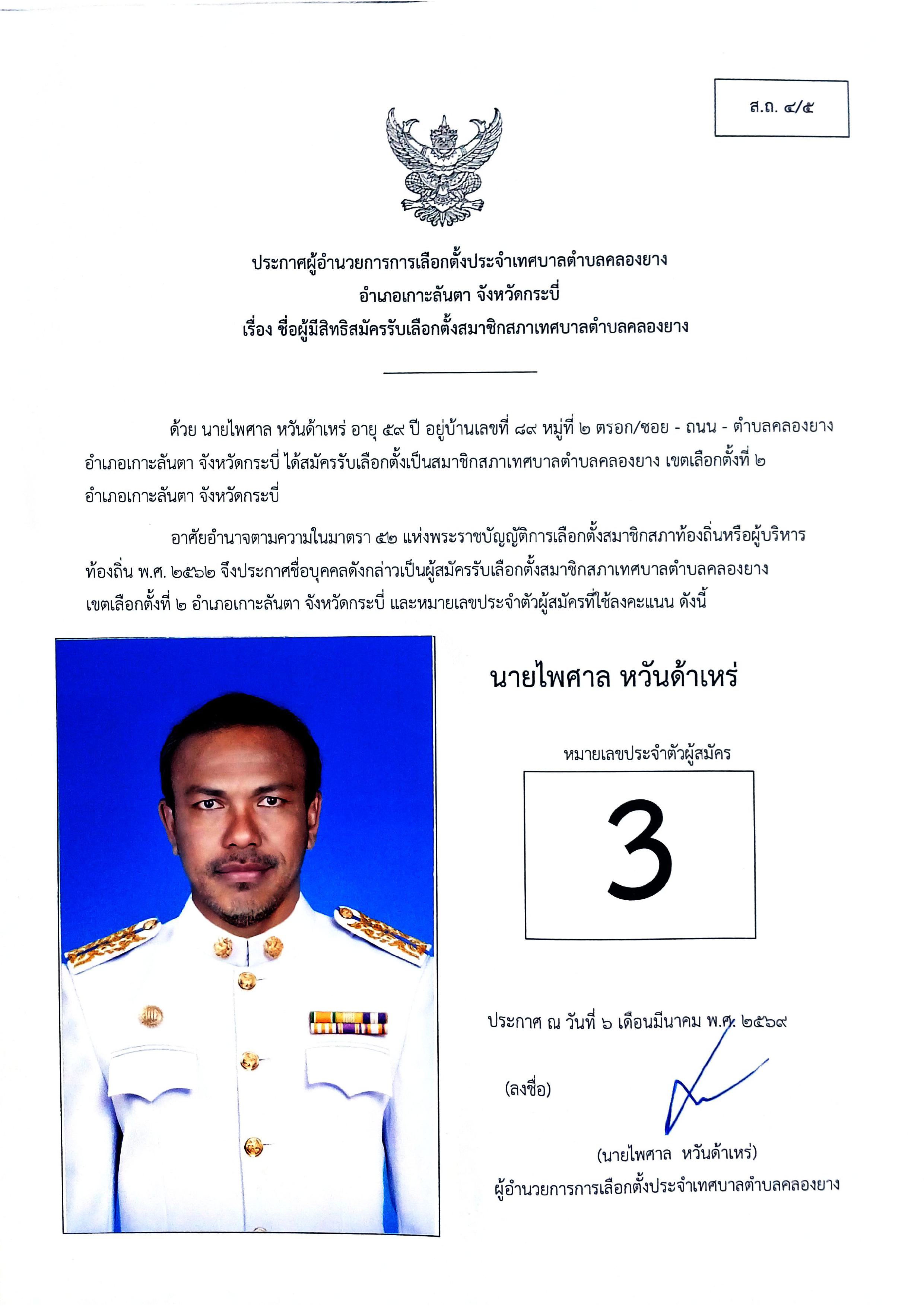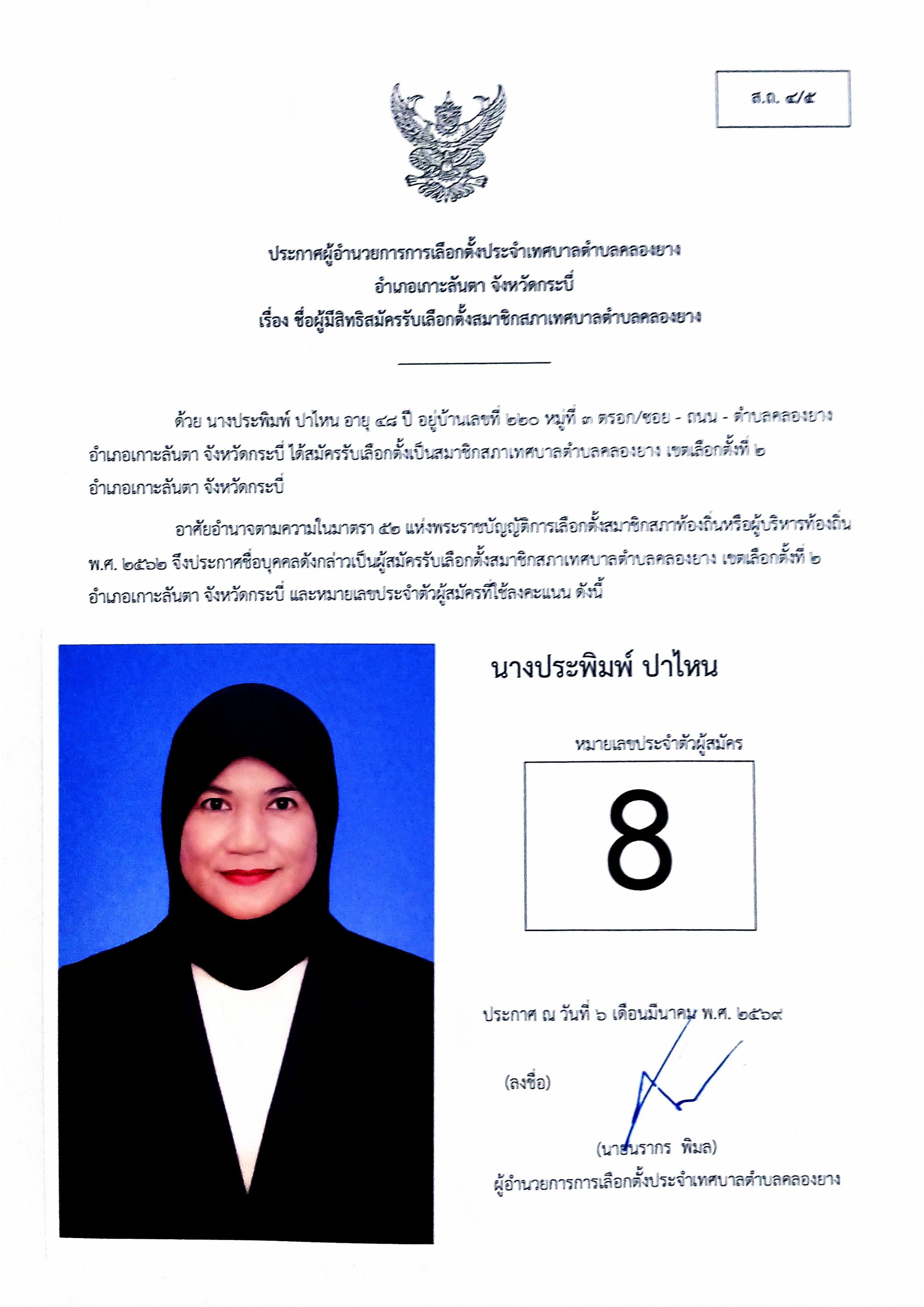 ประกาศชื่อผู้มีสิทธิสมัครรับเลือกตั้งสมาชิกสภาเทศบาลตำบลคลองยาง เขตเลือกตั้งที่ 2