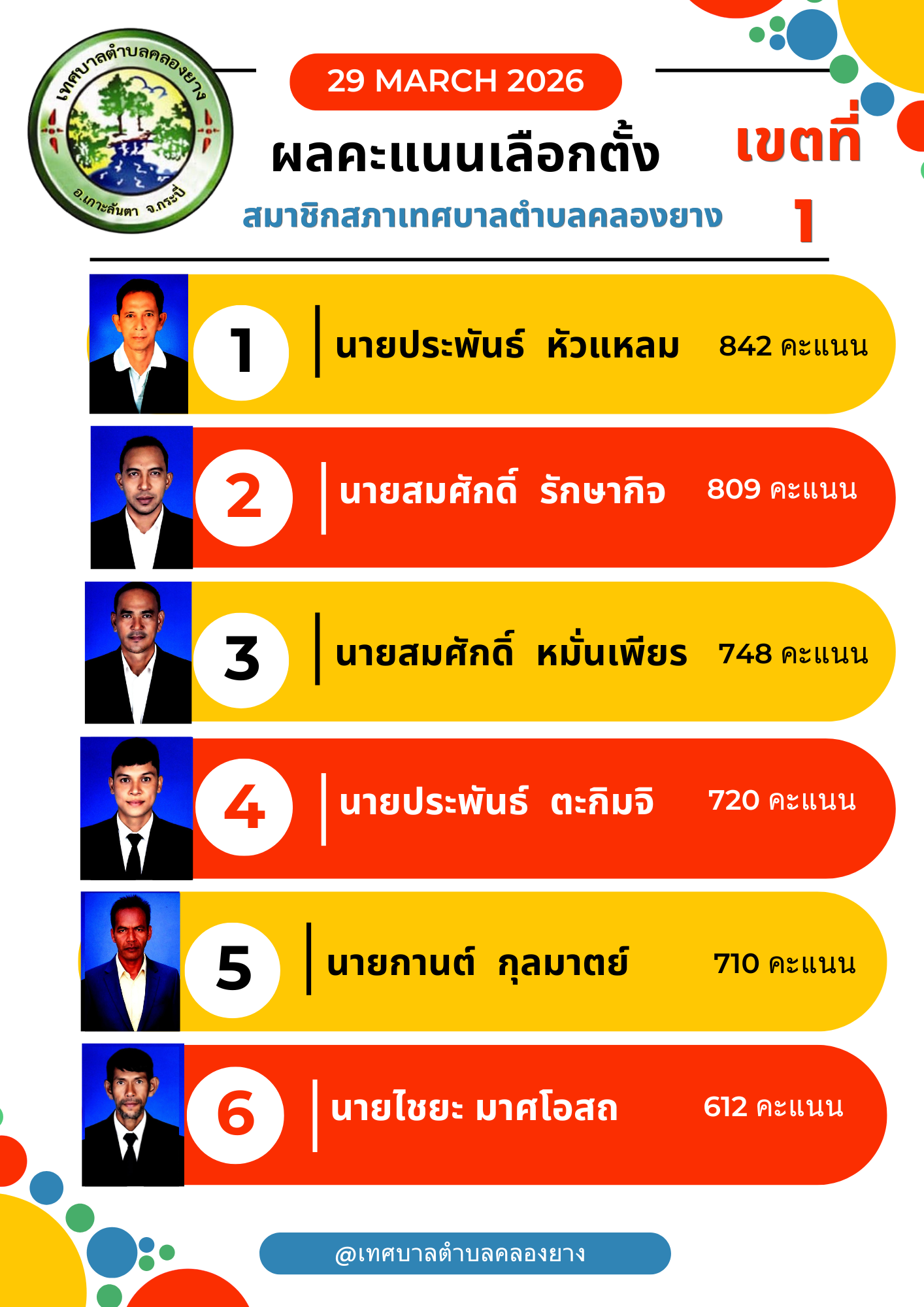 ผลการเลือกตั้ง สมาชิกสภาเทศบาลตำบลคลองยาง เขต 1