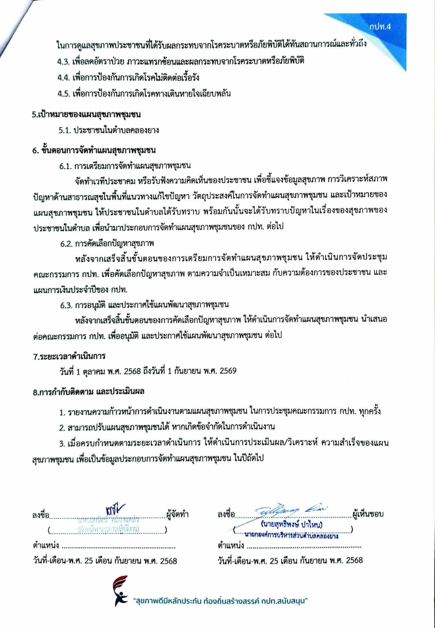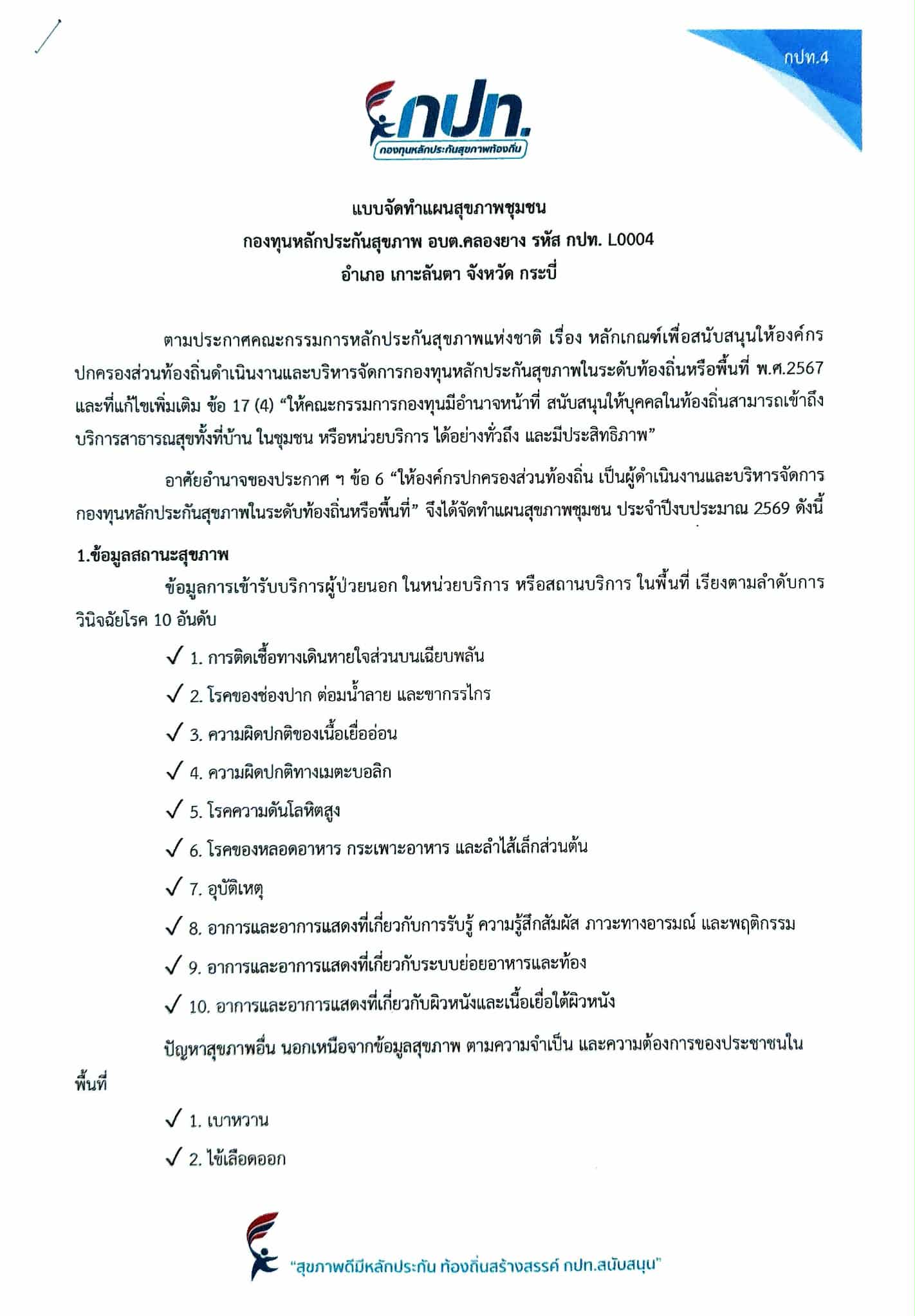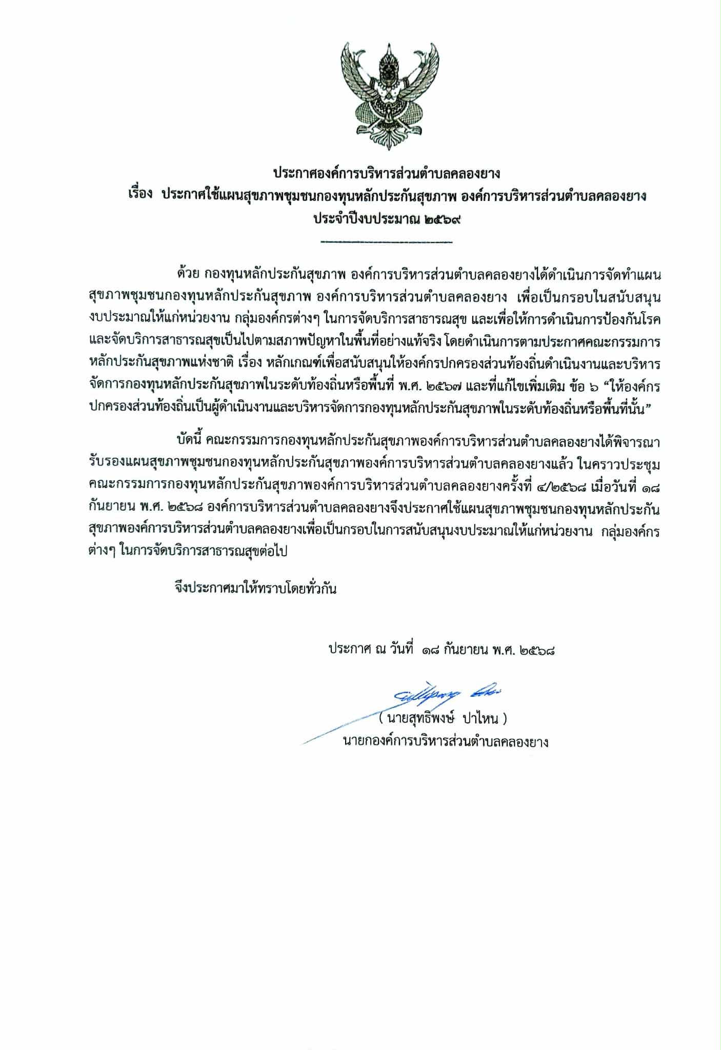 ประกาศใช้แผนสุขภาพชุมชนกองทุนหลักประกันสุขภาพ องค์การบริหารส่วนตำบลคลองยางประจำปีงบประมาณ 2569