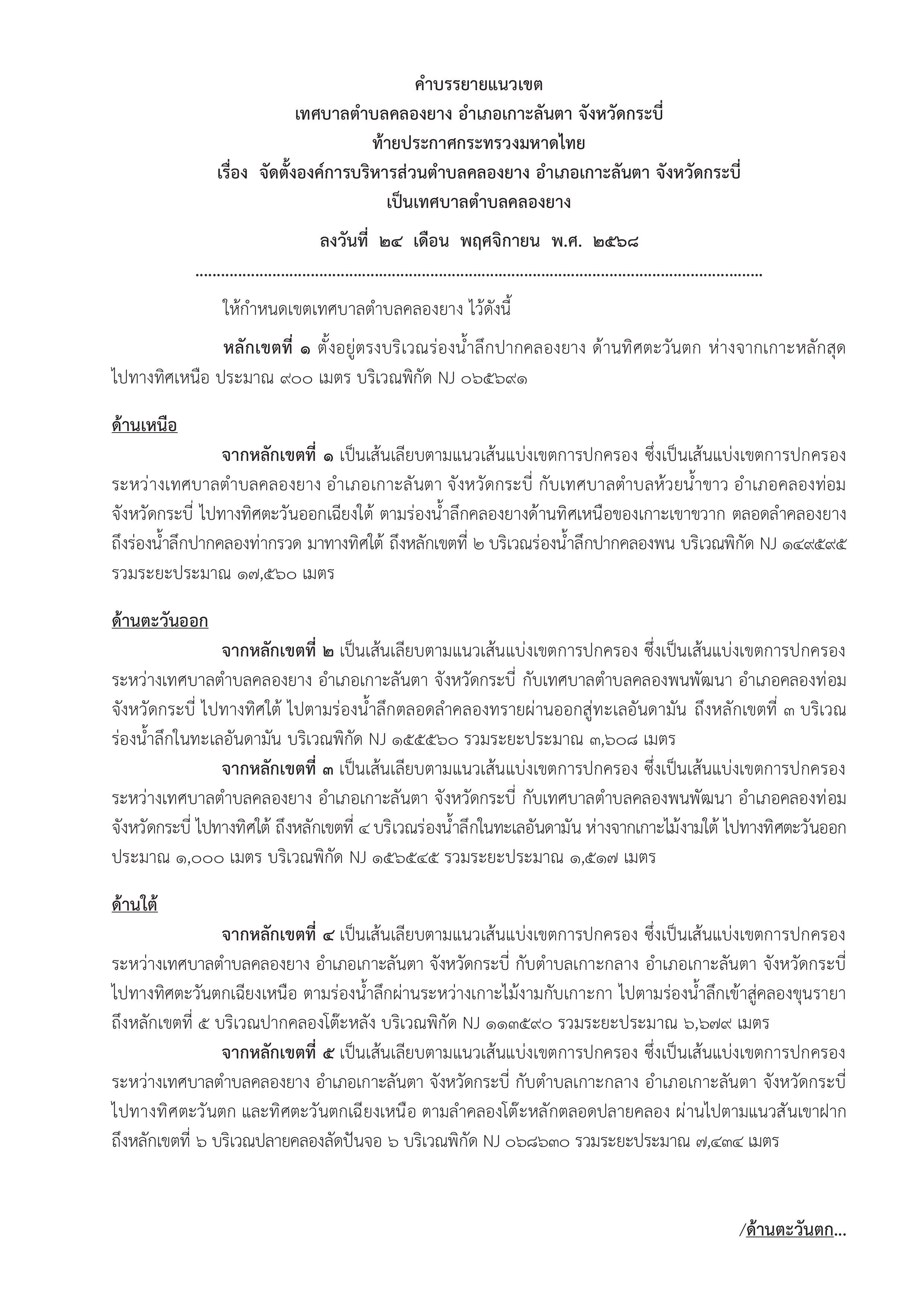 ประกาศราชกิจจานุเบกษา เรื่อง จัดตั้งองค์การบริหารส่วนตำบลคลองยาง อำเภอเกาะลันตา จังหวัดกระบี่ เป็นเทศบาลตำบลคลองยาง