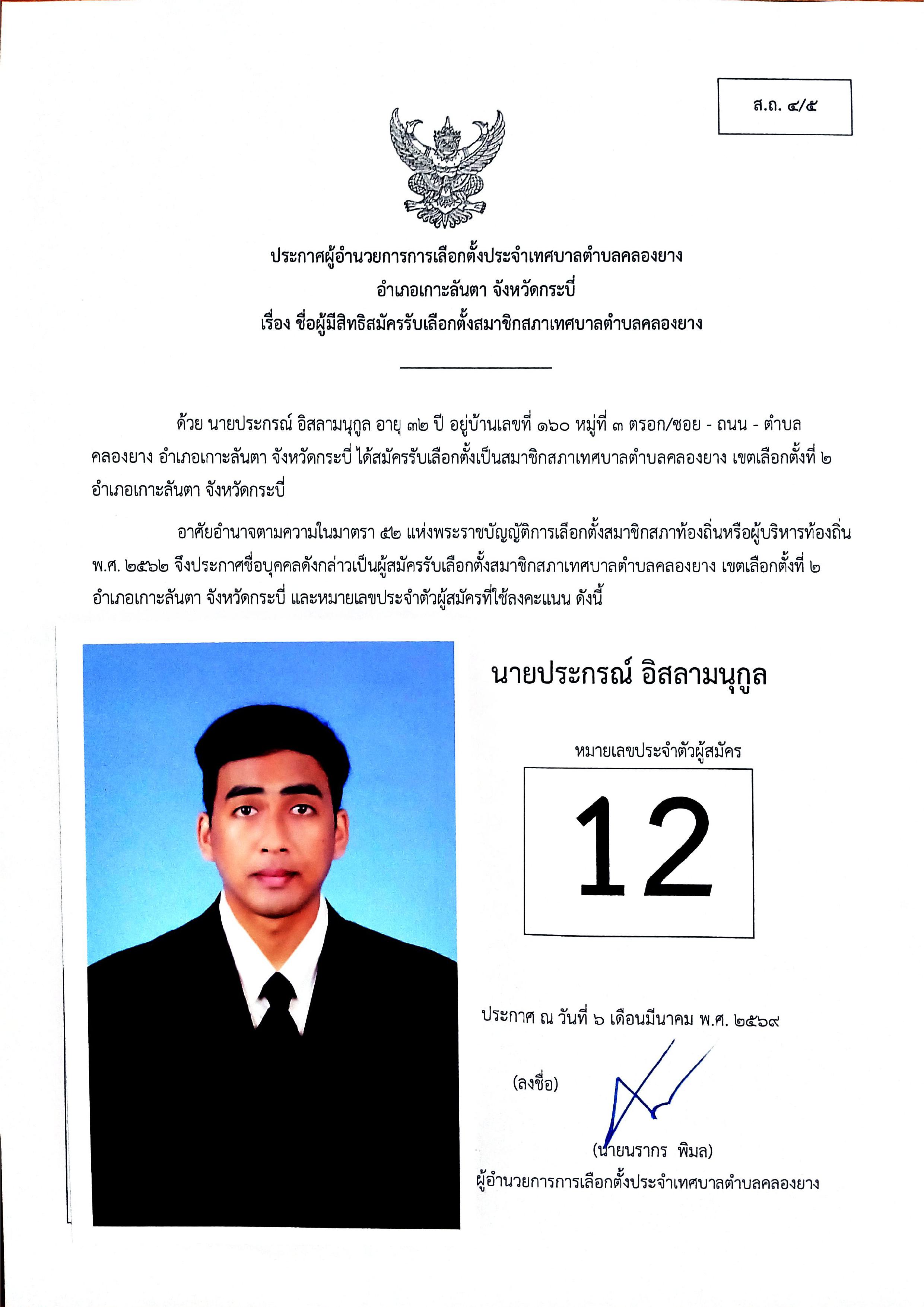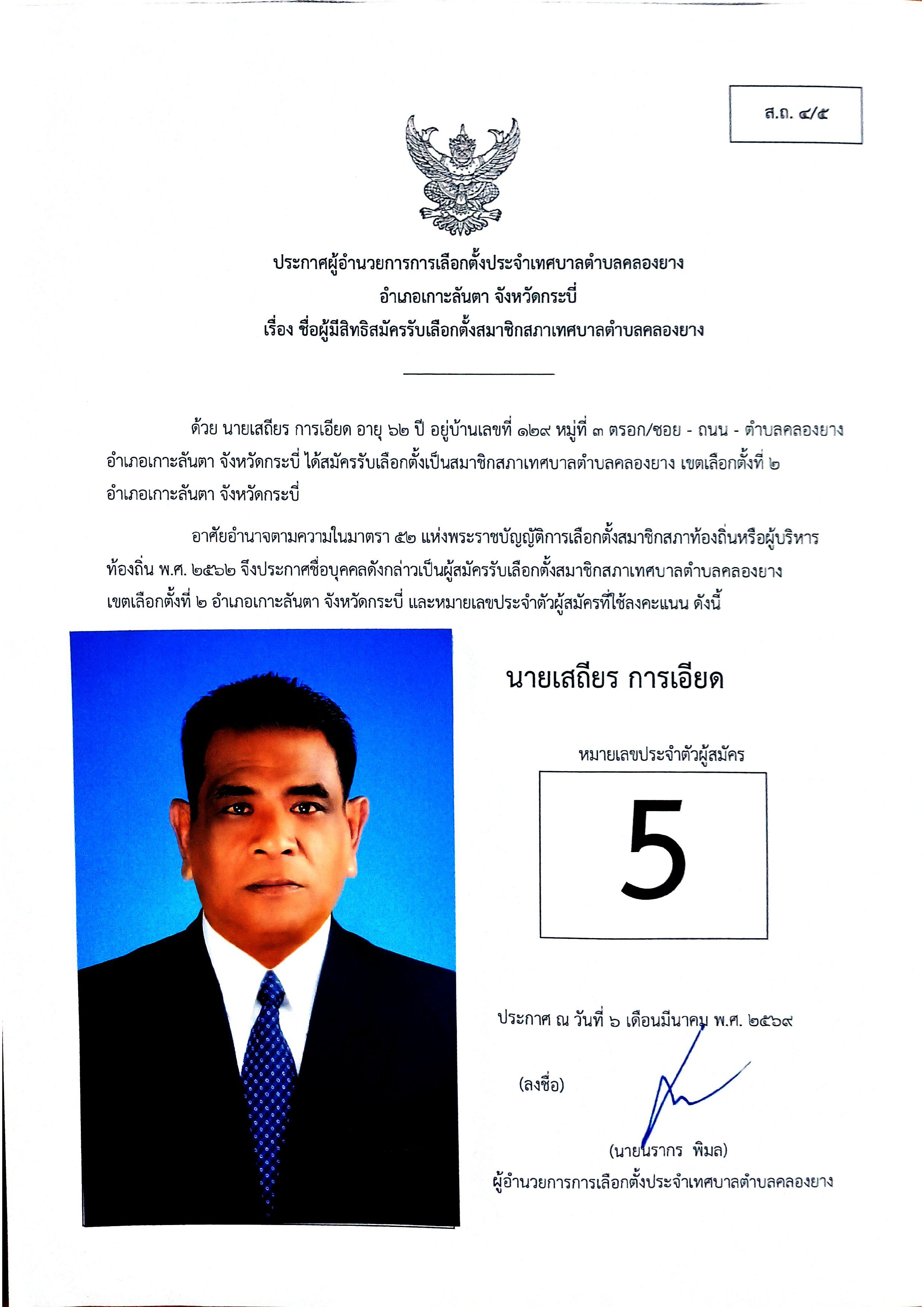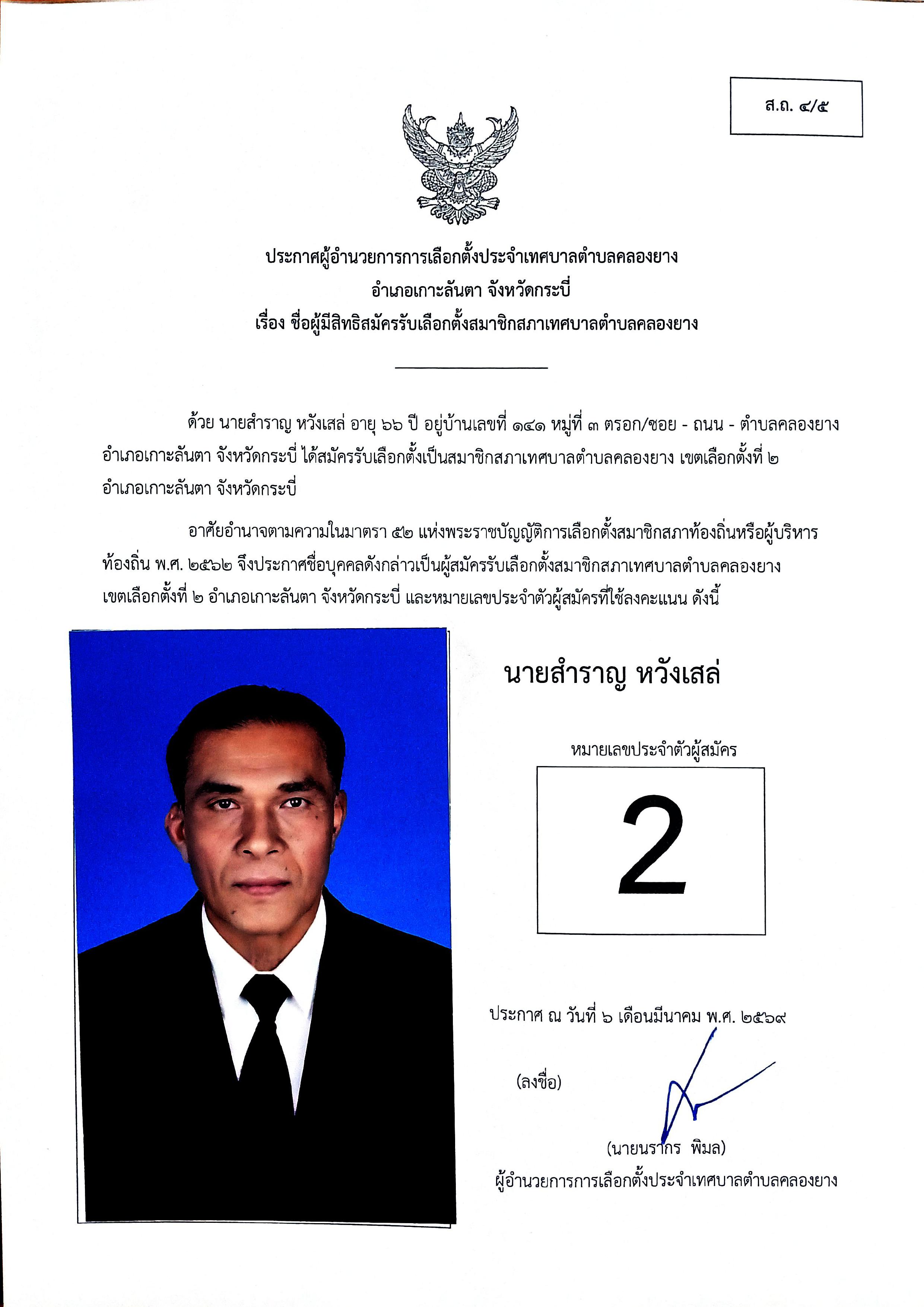 ประกาศชื่อผู้มีสิทธิสมัครรับเลือกตั้งสมาชิกสภาเทศบาลตำบลคลองยาง เขตเลือกตั้งที่ 2