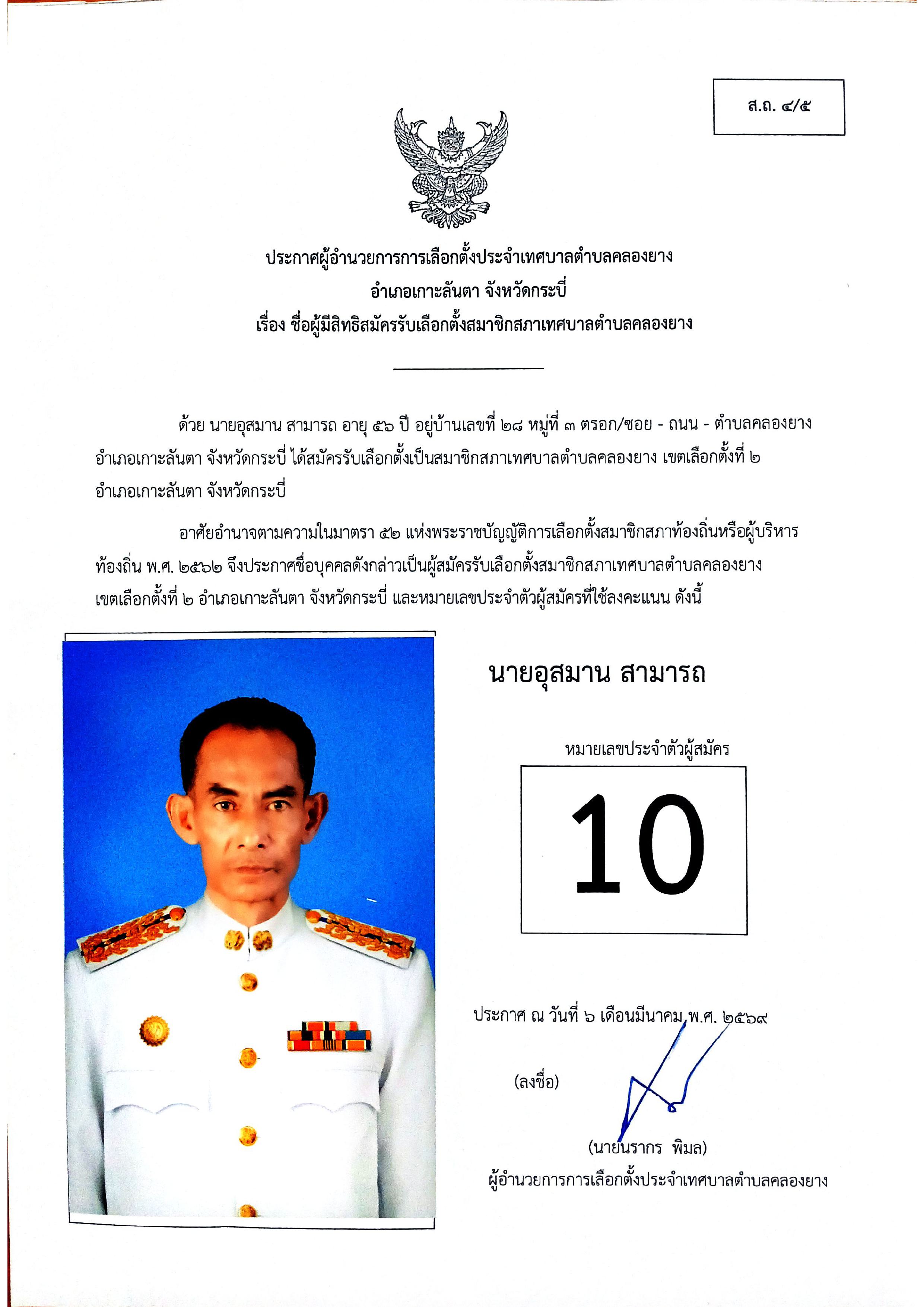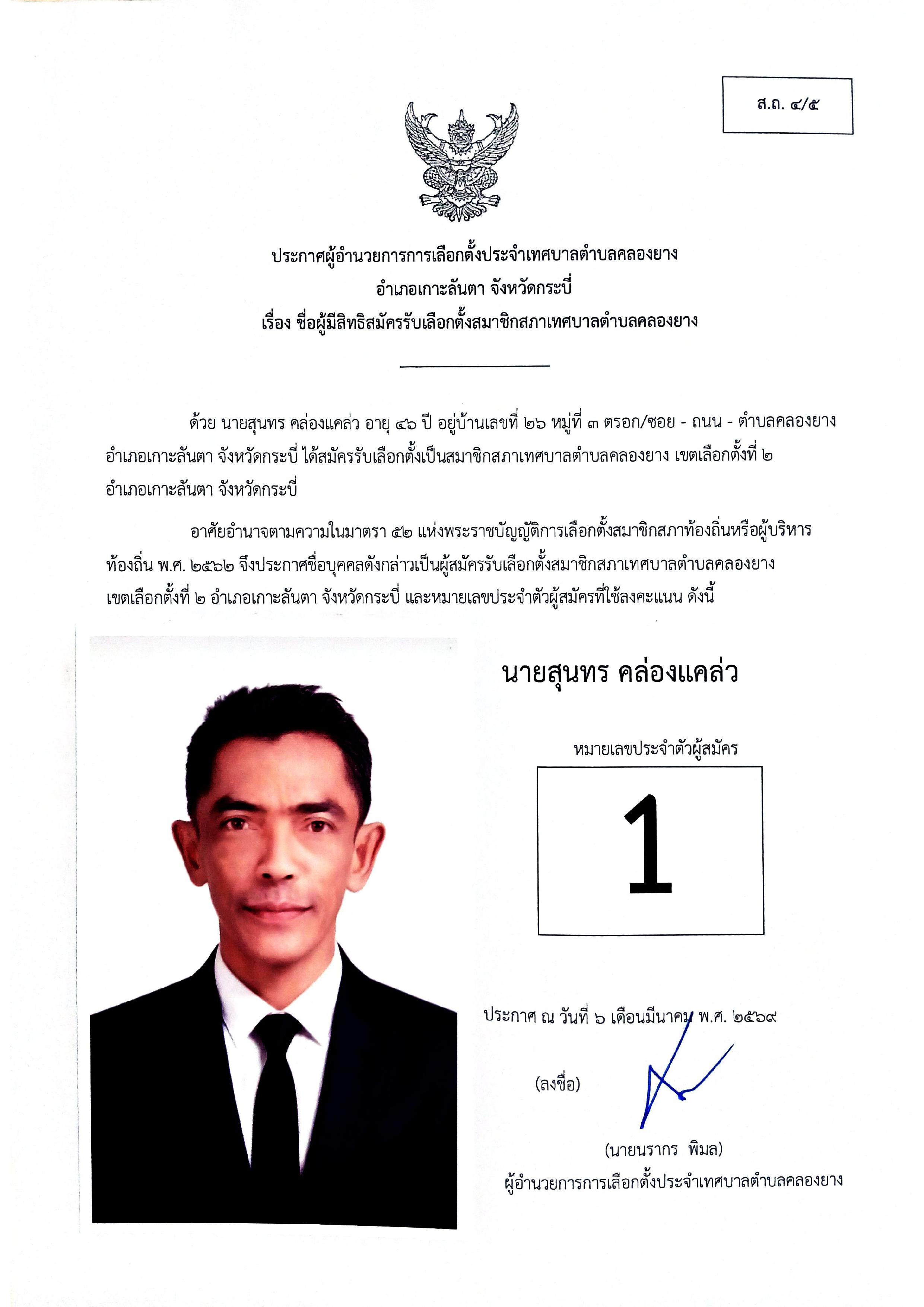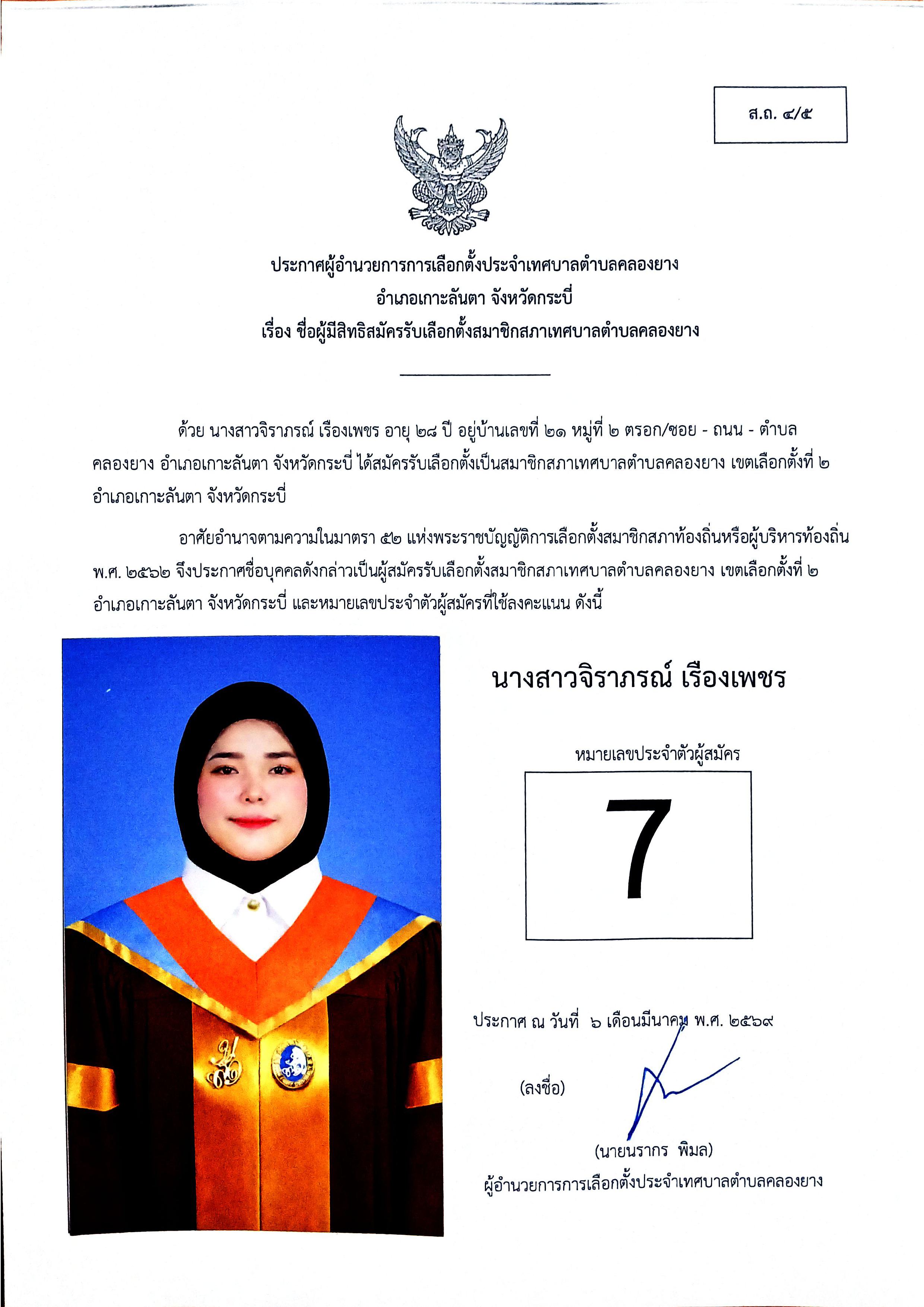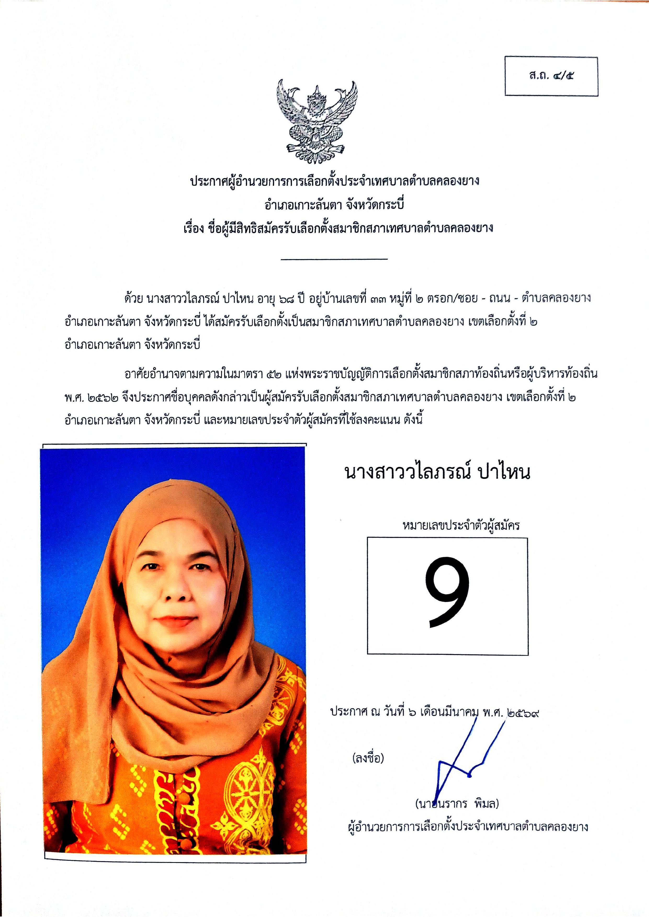 ประกาศชื่อผู้มีสิทธิสมัครรับเลือกตั้งสมาชิกสภาเทศบาลตำบลคลองยาง เขตเลือกตั้งที่ 2