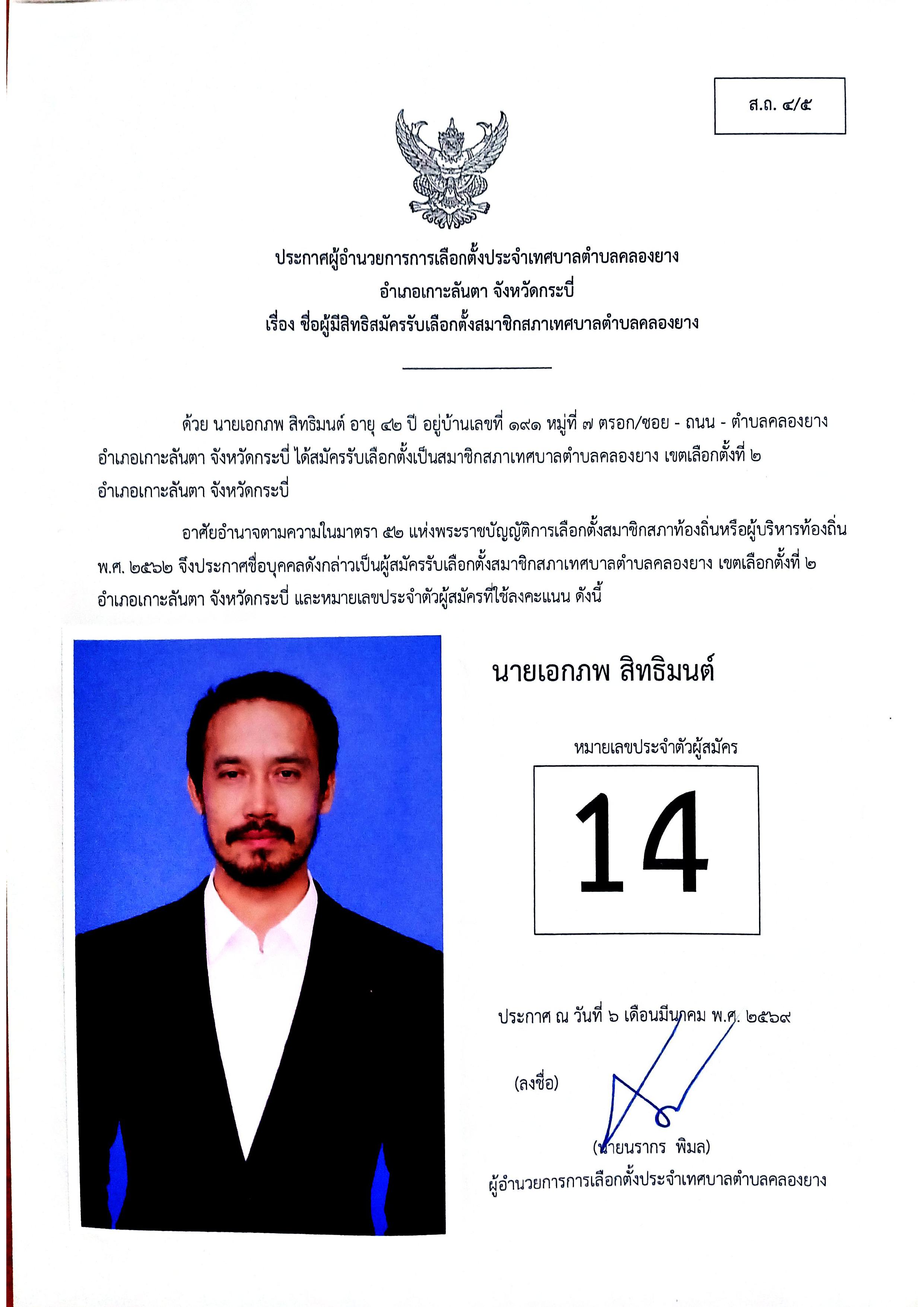 ประกาศชื่อผู้มีสิทธิสมัครรับเลือกตั้งสมาชิกสภาเทศบาลตำบลคลองยาง