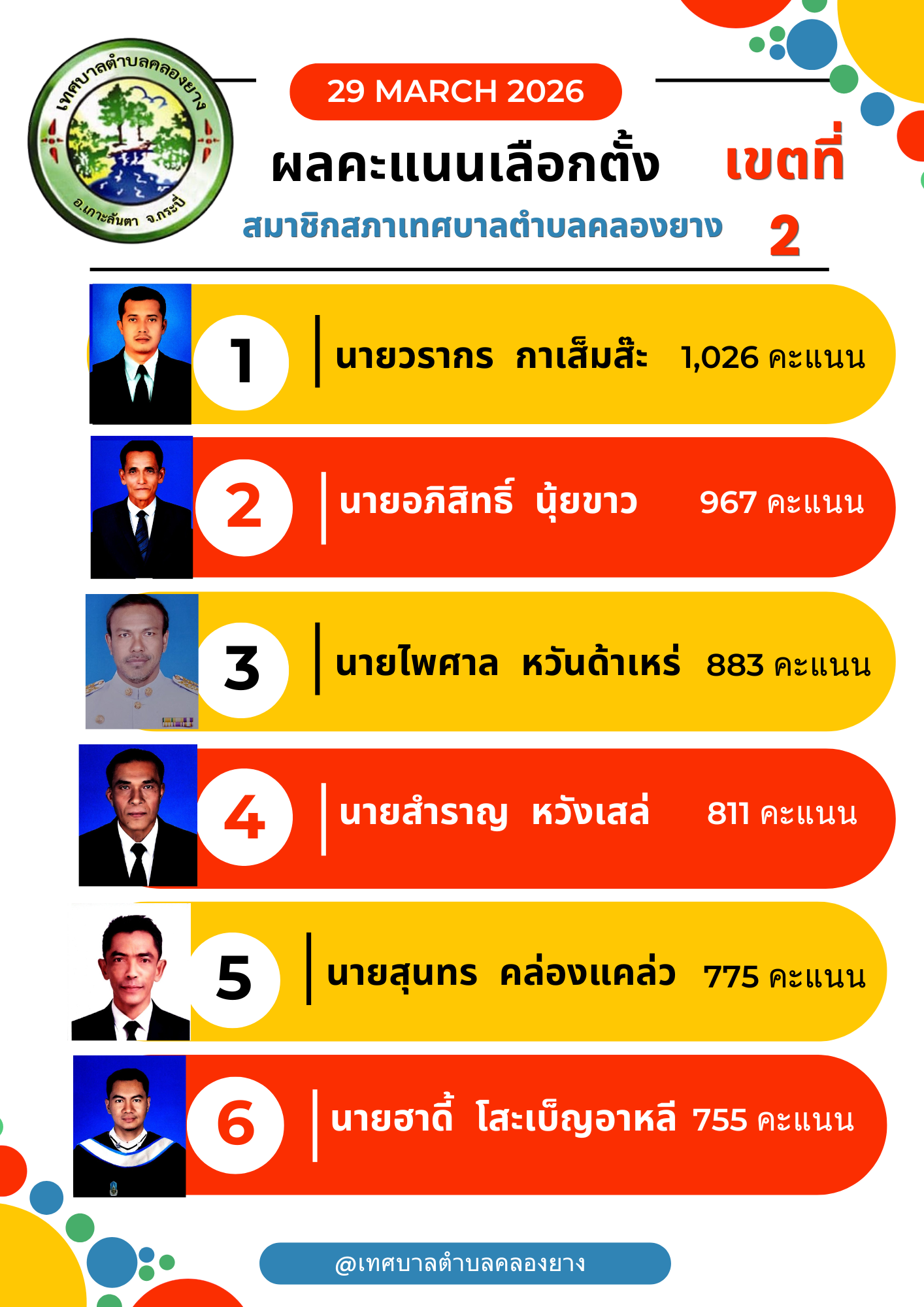 ผลการเลือกตั้ง สมาชิกสภาเทศบาลตำบลคลองยาง เขต 2